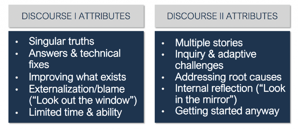 Often groups can fall into “Discourse I Attributes.” The consequences of this range from limiting perspectives that hide opportunities to perpetuating false narratives that support inequity and systemic disparities. Consciously bringing “Discourse II Attributes” into conversation can help groups to:
