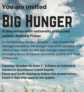 Nationally acclaimed author Andrew Fisher will be in Grand Rapids to discuss his book Big Hunger: The Unholy Alliance Between Corporate America and Anti-Hunger Groups.